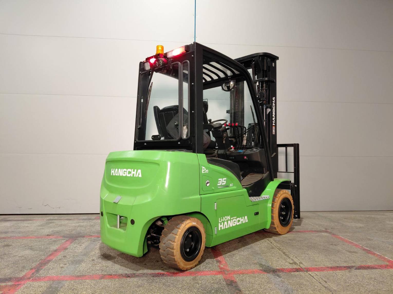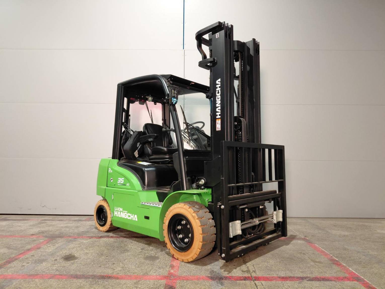| Détails | 3.8T XC Series Electric Forklift with Li-Ion and PMSM Technology, without Battery and Charger Color: Green RAL6018/Black CPD38-XCY2-SI 5.5M Triplex mast Solid tires Fingertip system (Buchholz 4 valve) 4th pipe Integrated sideshifter 1200mm 122*50*1150 IIIA forks Full PVC Shed Grammer seat MSG65/531 without armrest Rear Blue LED light Yunette pump Motor JinDao Reduction gear box OPS II DC-DC converter Rear working light EPB (Electric Park Brake) Speed reduction while steering (STD XC 2023) Mast damping system (3,5-5,5T) Yunette Traction Motor Panoramic mirror USB charger plug EVE lithium Battery 76.8V/304Ah Lithium charger (CIB1080150W3-038050-711-B05A00) |