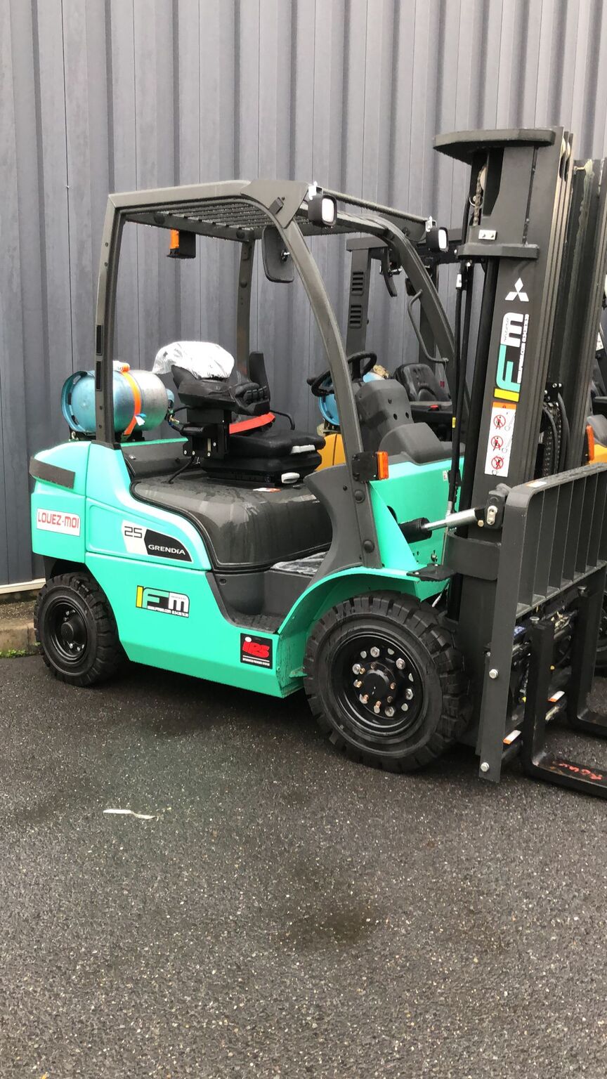 | Équipements | 4e valve arrivée au tablier, Mini levier, TDL (déplacement latéral), Positionneur de fourches, Dosserêt d'appui de charge, Blue spot arrière |